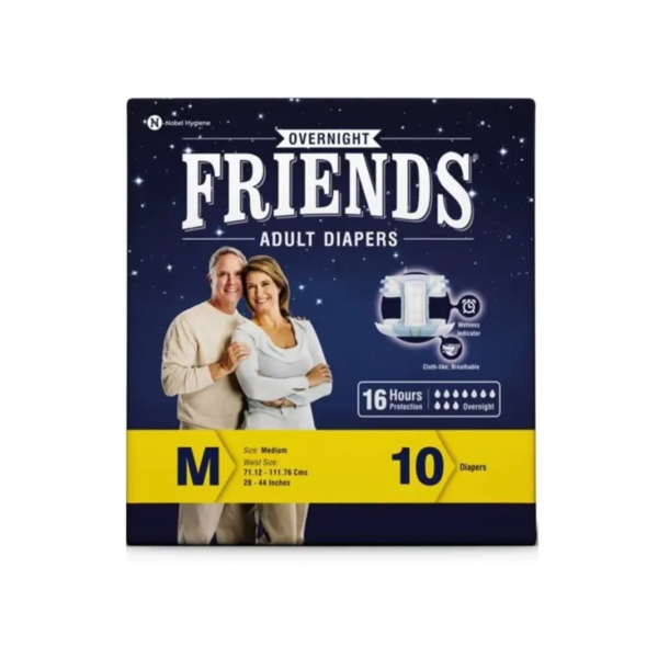 חיתולים למבוגרים Friends Over Night במידה M: ספיגה גבוהה עד 16 שעות. שכבה כפולה לתחושת יובש, מניעת דליפות ונטרול ריחות. סוגרים רחבים לנוחות מרבית. מדד רטיבות חכם לזיהוי קל של הצורך בהחלפה. מתאים להיקף מותניים 71-112 ס"מ.