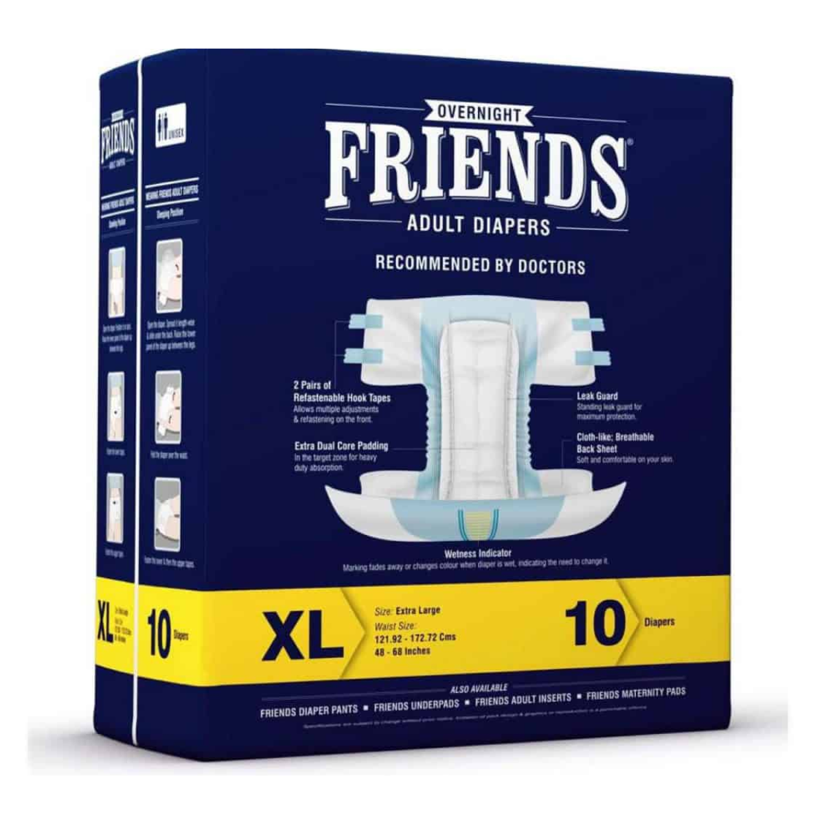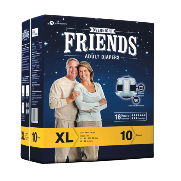חיתולים למבוגרים Friends over night בעלי כושר ספיגה גבוה במיוחד. מעניקים ספיגה של עד כ-16 שעות ללילה שלם ויבש. חיתולי "פרינדס" בעלי מדד מיוחד (פס לאורך החיתול) המשנה את צבעו לכחול כאשר החיתול רטוב וכך ניתן לדעת מתי צריך להחליף. מידה XL – היקף מותניים: 122-173 ס”מ.
